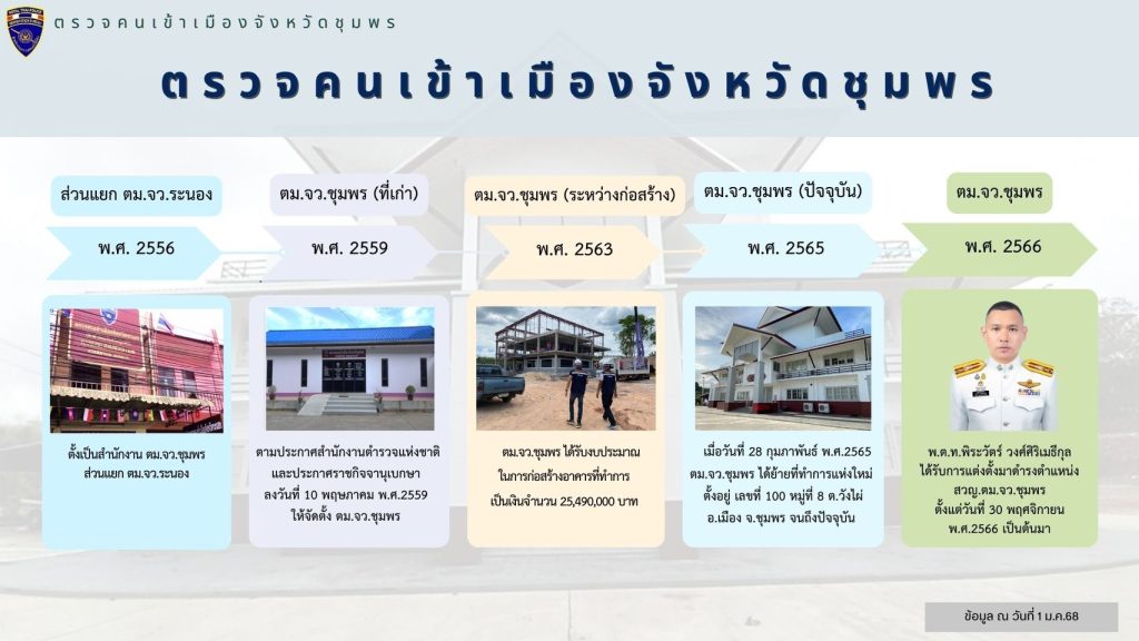 In 2020, Immigration in Chumphon Province received a budget for the construction of an office building in the amount of 25,490,000 Baht. The construction contract was started on September 28, 2020, and was completed on December 22, 2021. The inspection committee unanimously agreed to accept the finished building on December 28, 2021.
