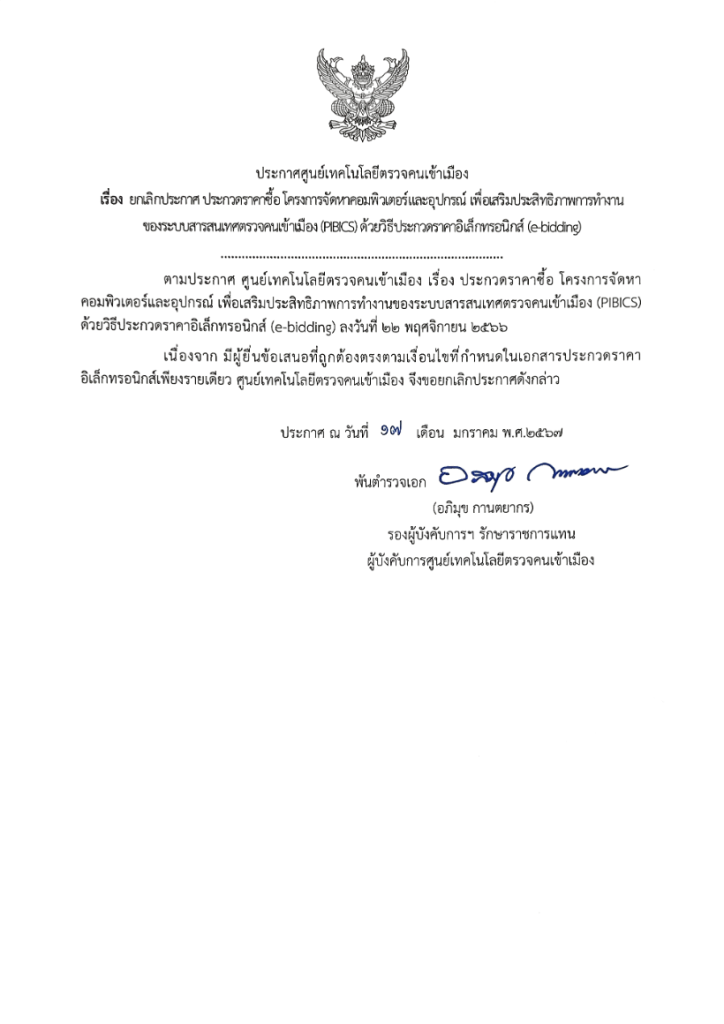 ยกเลิกประกาศและเอกสารประกวดราคาซื้อ โครงการจัดหาคอมพิวเตอร์และอุปกรณ์เพื่อเสริมประสิทธิภาพการทำงานของระบบสารสนเทศตรวจคนเข้าเมือง (PIBICS) ด้วยวิธีประกวดราคาอิเล็กทรอนิกส์ (e-bidding)