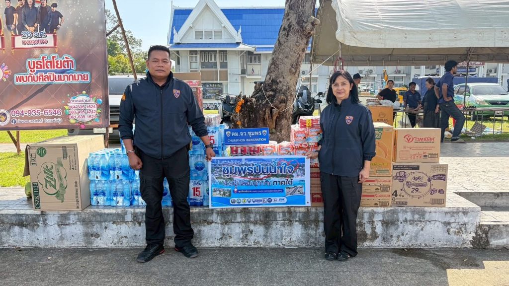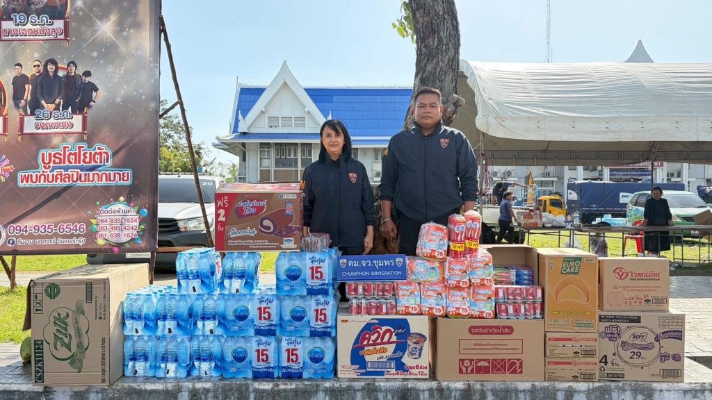 วันนี้ (27 พ.ย.68) เวลา 15.00 น. ภายใต้การอำนวยการของ พล.ต.ต.ชูธเรศ ยิ่งยงดำรงสกุล ผบก.ตม.6, พ.ต.อ.ภาณุภาคยณ์ จิตต์ประยูรตี รอง ผบก.ตม.6 โดย พ.ต.ท.พิระวัตร์ วงศ์ศิริเมธีกุล สวญ.ตม.จว.ชุมพร มอบหมายให้ ว่าที่ ร.ต.ท.หญิง กรกฏ งามประดิษฐ รอง สว.(อก.) ตม.จว.ชุมพร พร้อมด้วยข้าราชการตำรวจในสังกัดฯ ร่วมกิจกรรม ชุมพรปันน้ำใจ ช่วยผู้ประสบอุทกภัยภาคใต้ ณ บริเวณลานหน้าองค์การบริหารส่วนจังหวัดชุมพร ต.ท่าตะเภา อ.เมืองชุมพร จว.ชุมพร