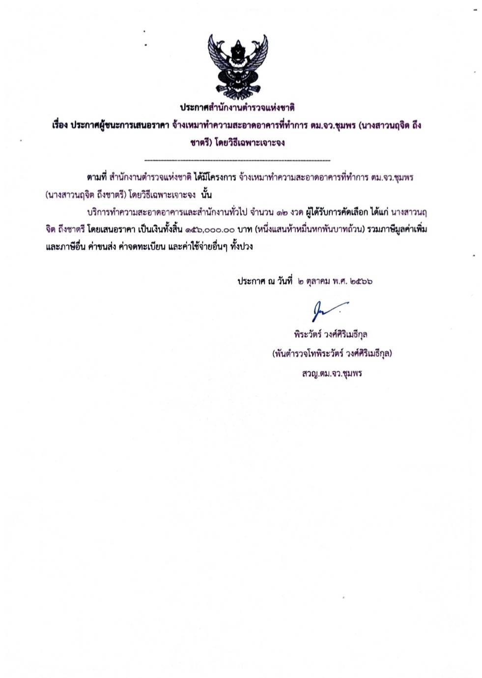 ประกาศผู้ชนะการเสนอราคา จ้างเหมาทำความสะอาดอาคารที่ทำการ ตม.จว.ชุมพร (น.ส.พรทิพย์ นาพิรุณ) โดยวิธีเฉพาะเจาะจง