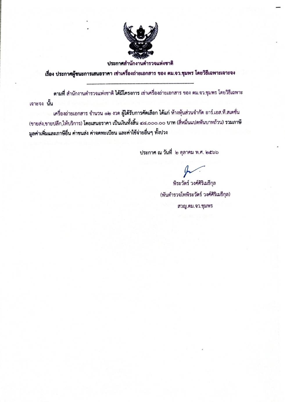 ประกาศผู้ชนะการเสนอราคา เช่าเครื่องถ่ายเอกสารของ ตม.จว.ชุมพร โดยวิธีเฉพาะเจาะจง