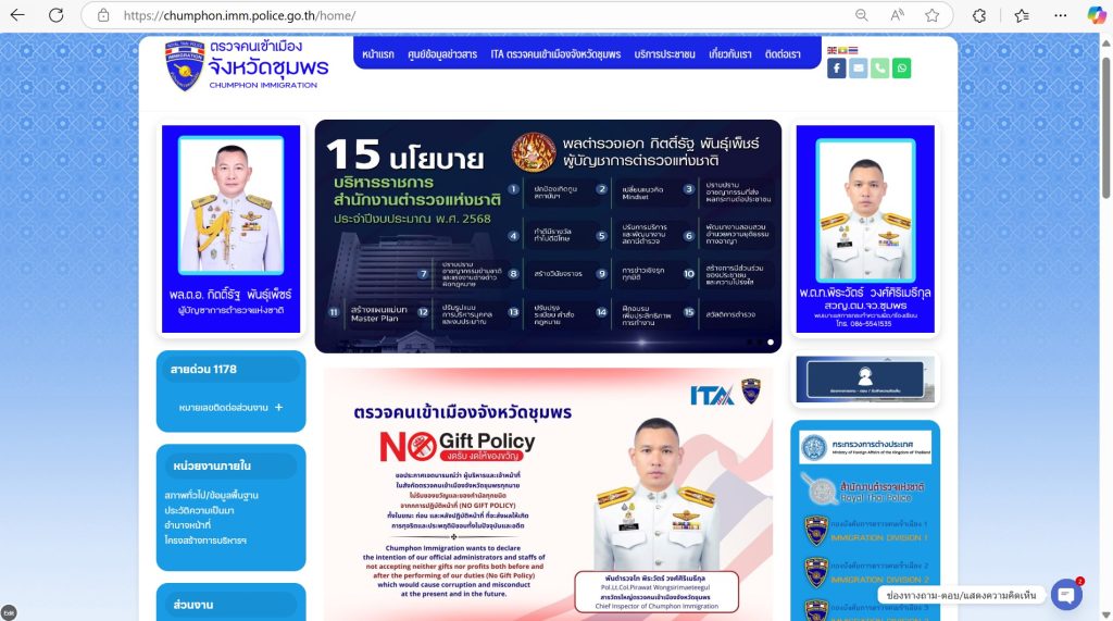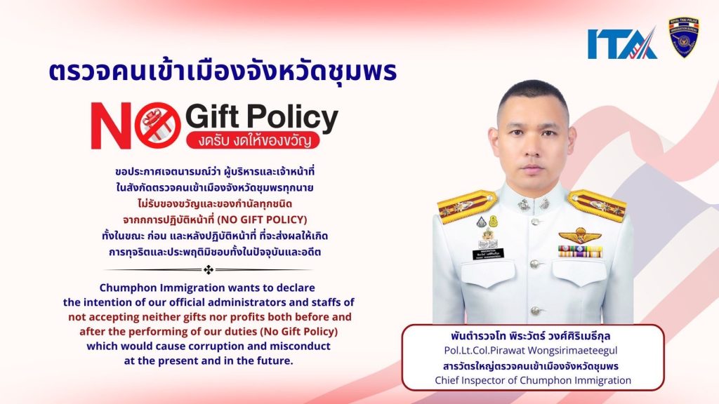 Chumphon Immigration adheres to “No Gift Policy” good governance practices, shall NOT ACCEPT any gift, souvenir, reception or any other interests for new year festival and in every occasion. Thank you for your good will and good wishes.
